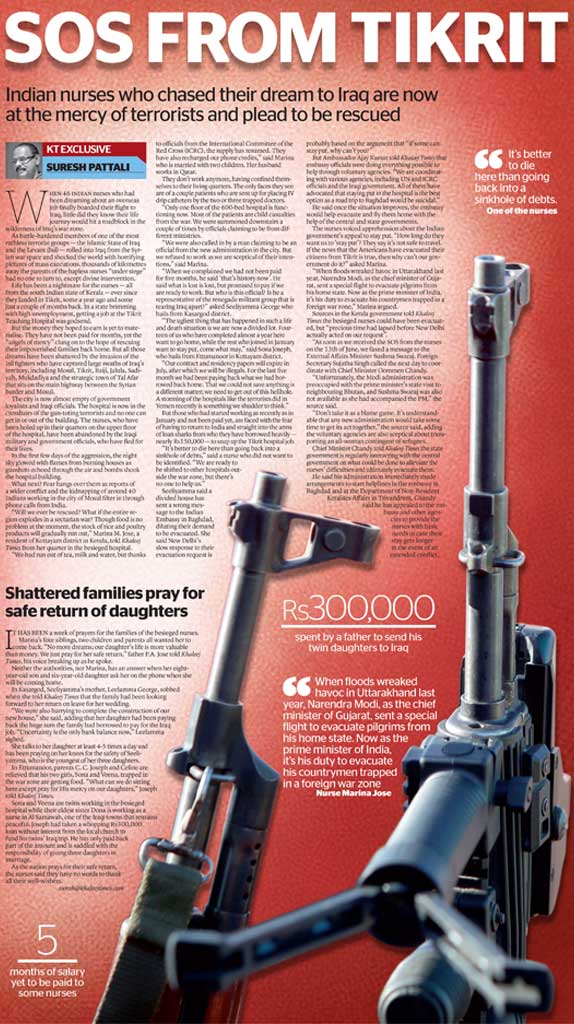 This was a journey I undertook without the pretensions of a scribe. On one side are your ethics, and your hunger to milk the source to the last tiny drop of information. When international journalists and TV networks were groping in the dark, I managed to break through terror barricades and lay a “hotline” to a key source among the 46 Indian nurses held captive in 2014 by Daesh, the world’s most brutal terrorists at the Tikrit Teaching Hospital in Iraq. It was a painful dilemma for a reporter who calls people trapped in a war zone. When the Indian ministry of external affairs parroted to the Press in New Delhi that the nurses were safe, I brought out the plight of the shell-shocked victims day-by-day. My reports were the barometer of the captives’ emotions and requirements.